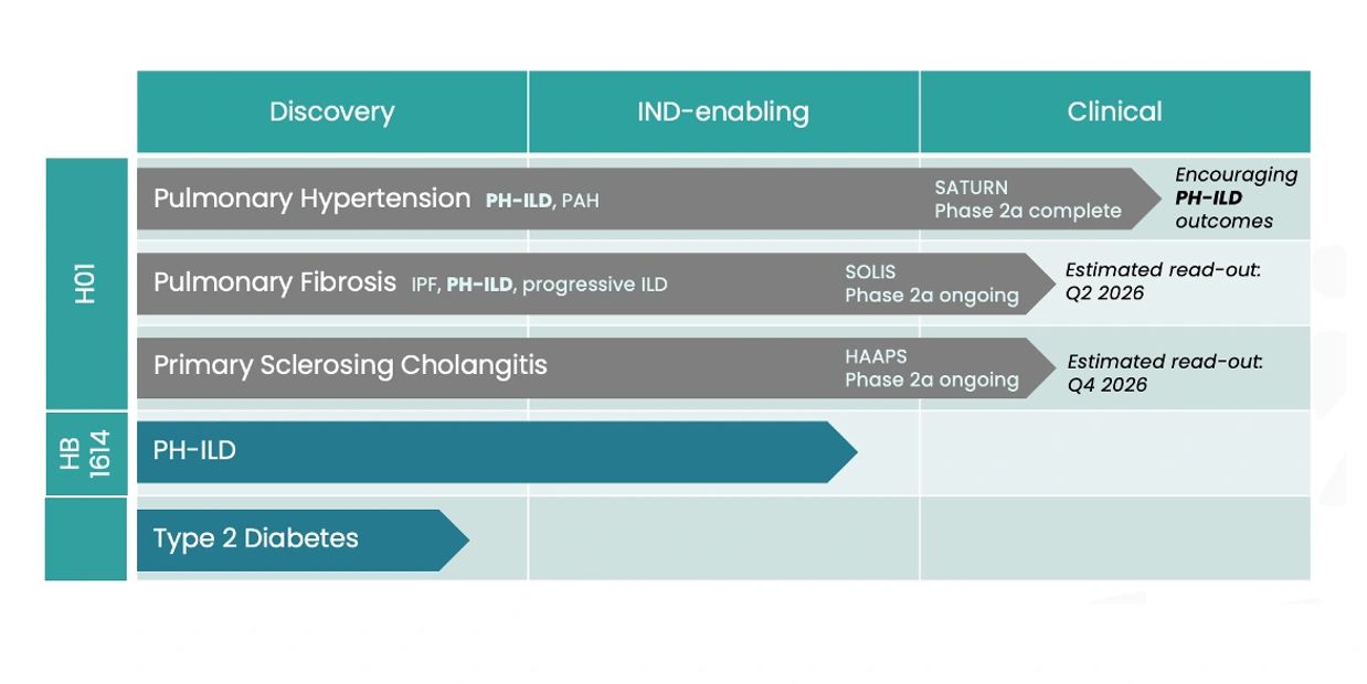 The company is advancing its lead clinical program for HB-1614 in pulmonary hypertension and interstitial lung disease (PH-ILD) and has initiated an earlier stage development program in diabetes.